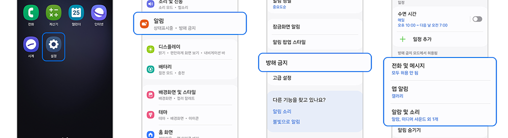 • λ°©λ²: μ€μ > μλ¦Ό > λ°©ν΄ κΈμ§ > μλμΌλ‘ μ€μ